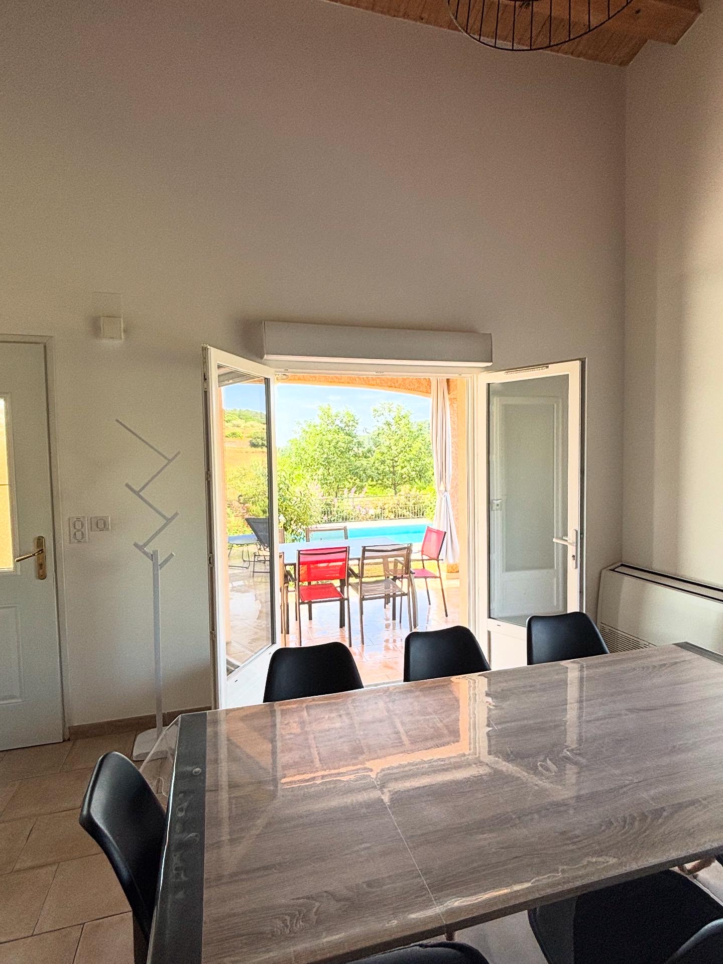 L’espace repas dispose d’une grande table modulable avec rallonges, pouvant accueillir jusqu’à 8 personnes confortablement.