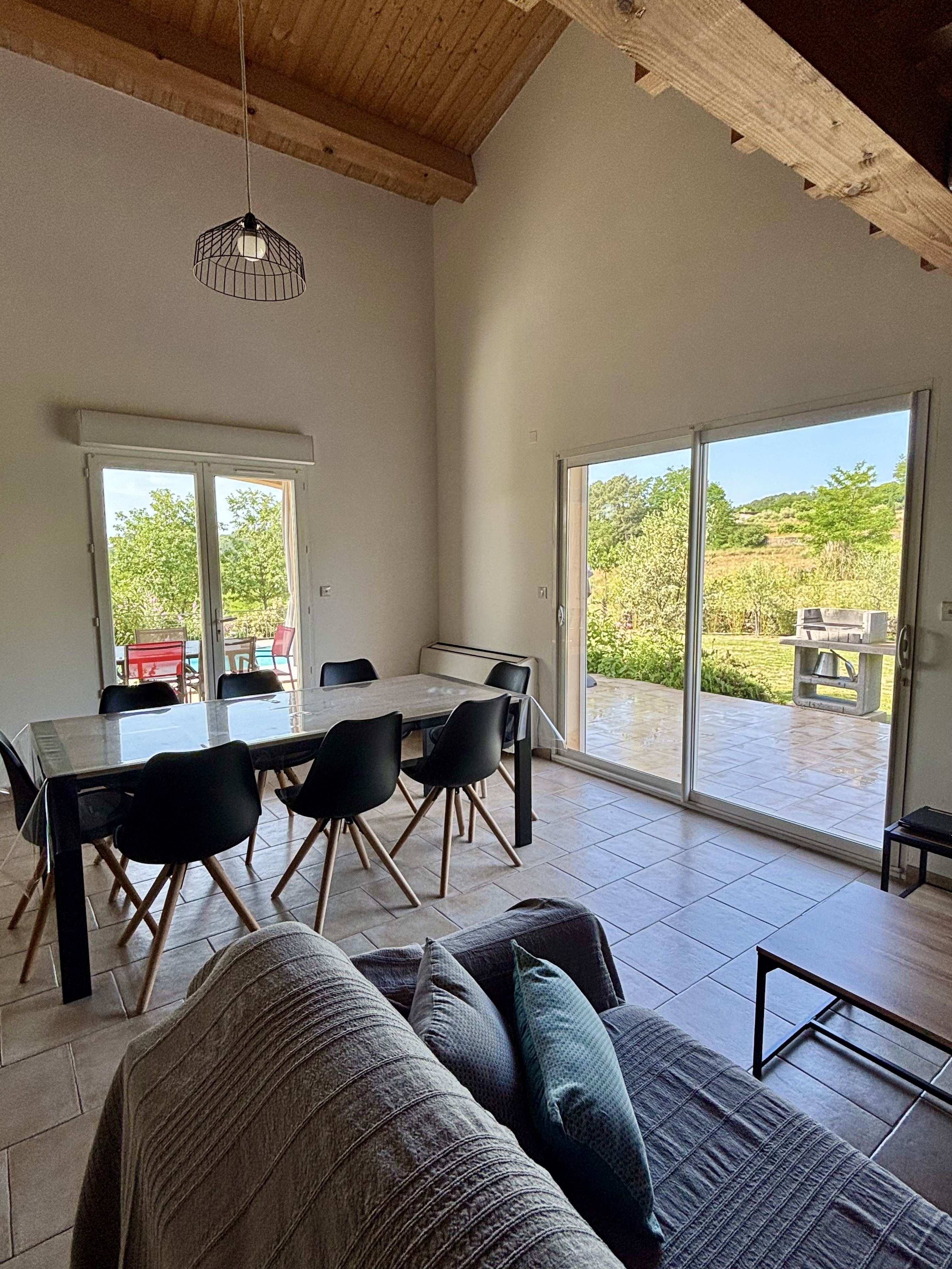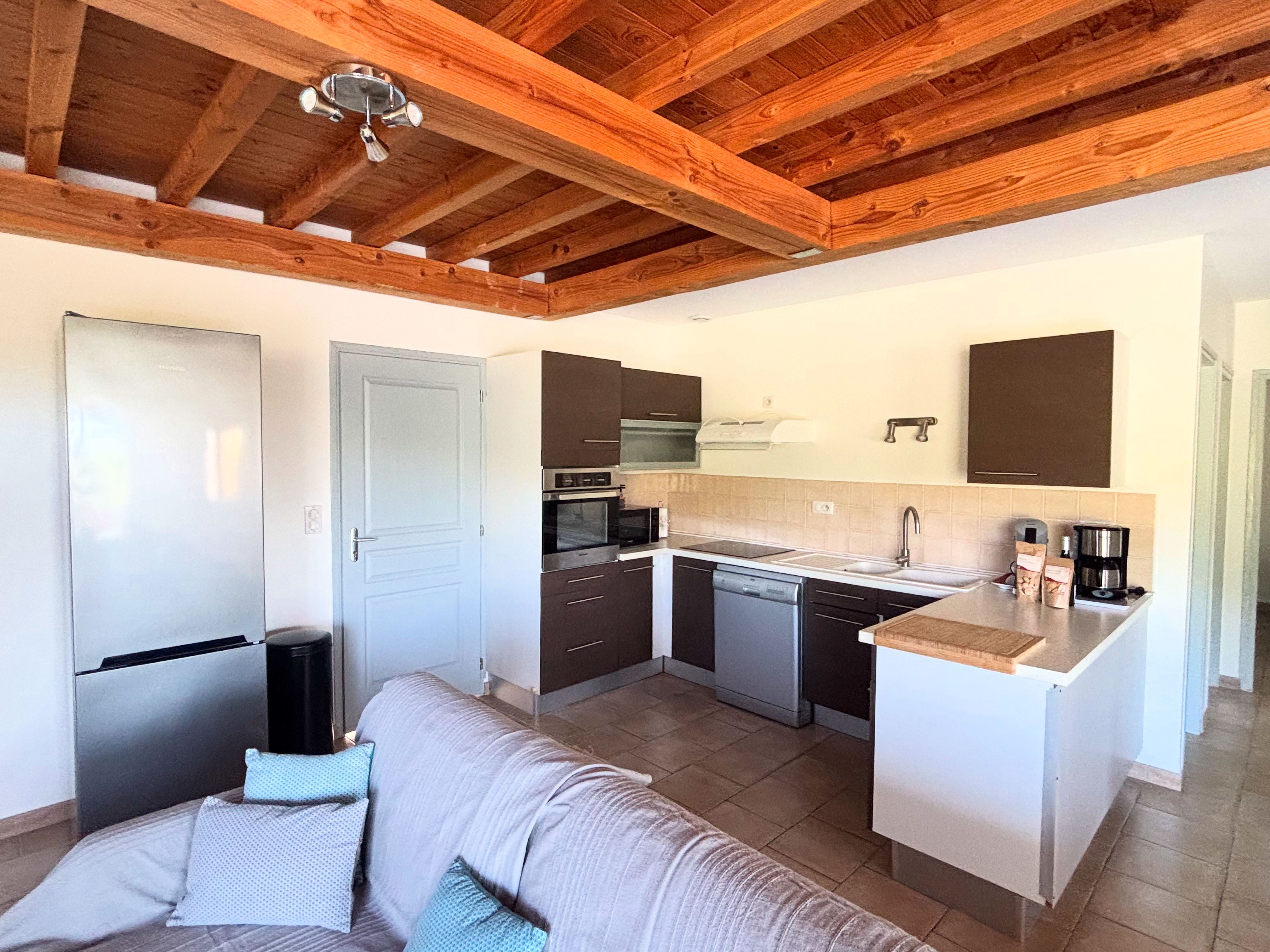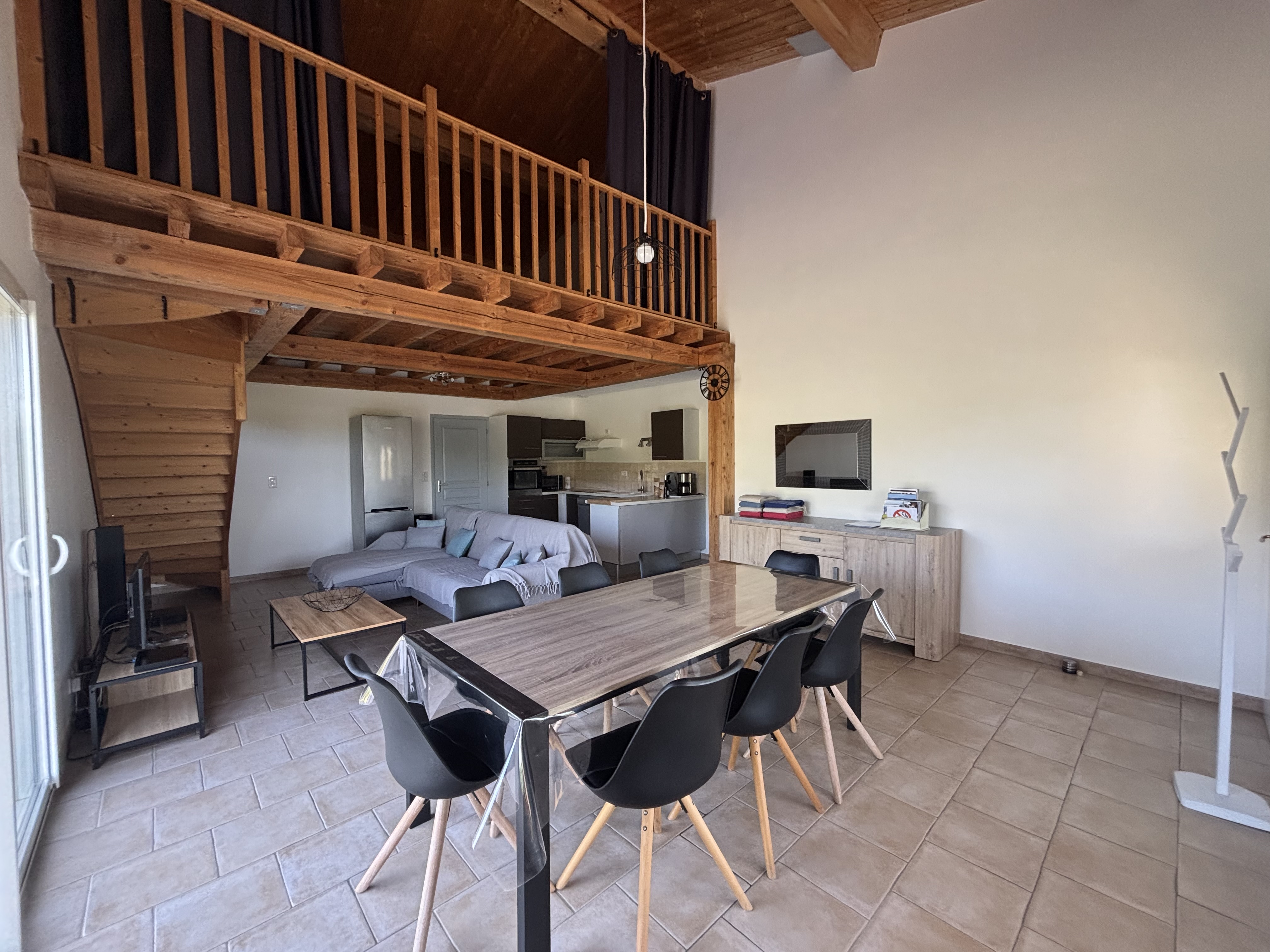 La maison dispose d’une grande pièce principale lumineuse qui réunit cuisine, salon et salle à manger dans un espace convivial, parfait pour les moments partagés.