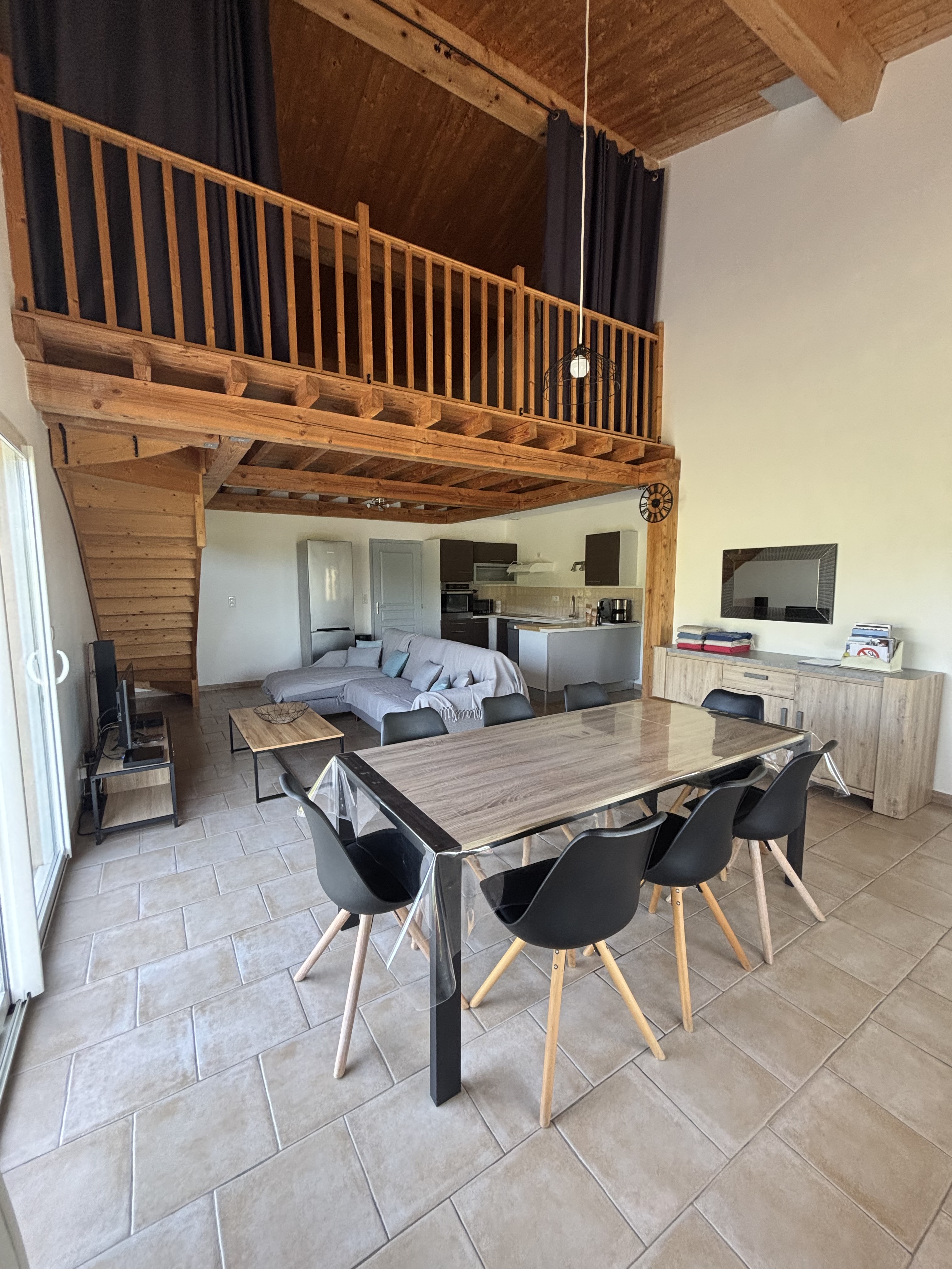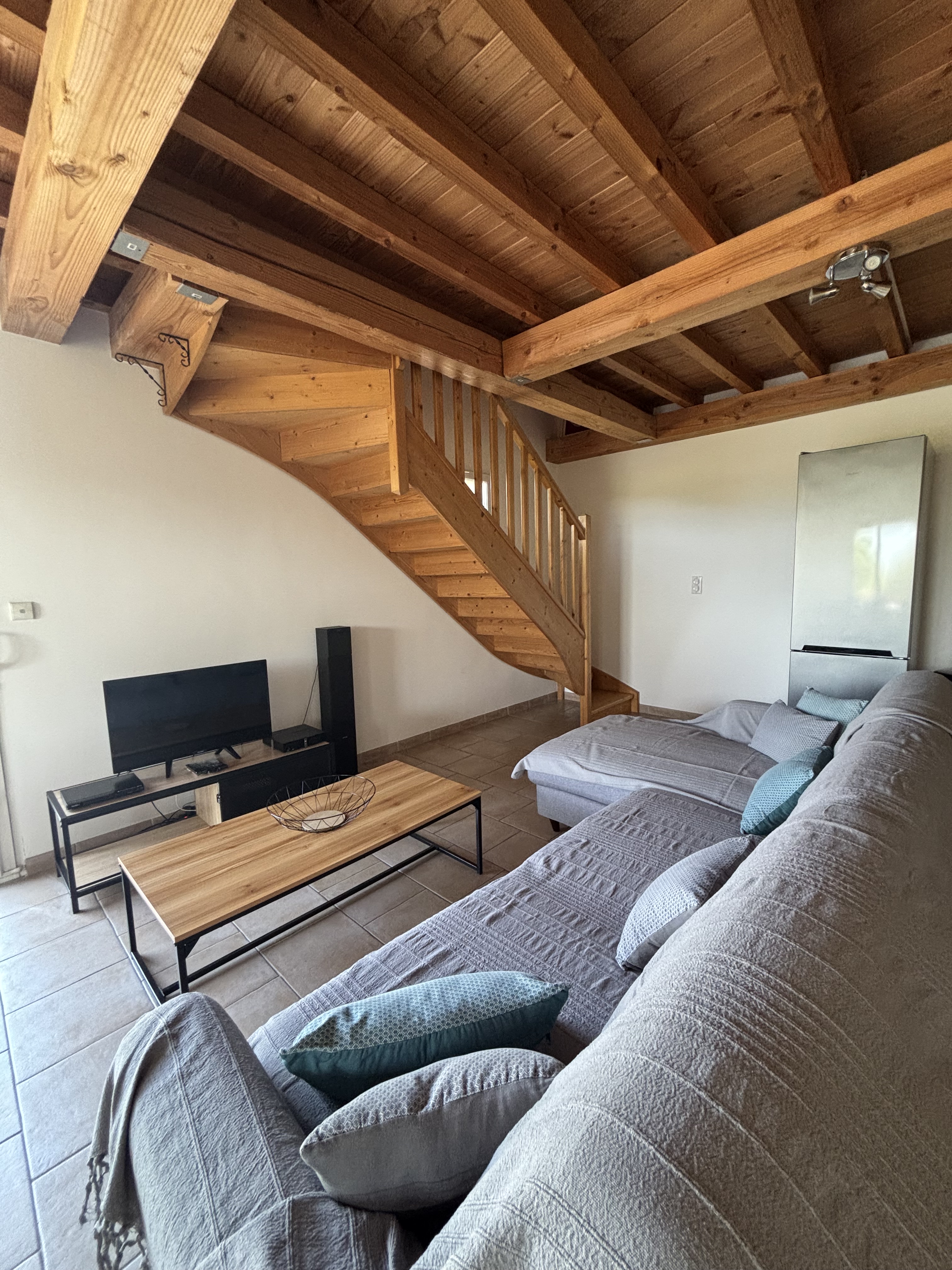 Accessible par un escalier depuis la pièce de vie, la mezzanine offre un espace supplémentaire confortable, idéal pour les enfants, les ados, pour se détendre en toute tranquillité, ou encore pour télétravailler. Aménagée avec soin, elle permet d’optimiser l’espace de la maison.