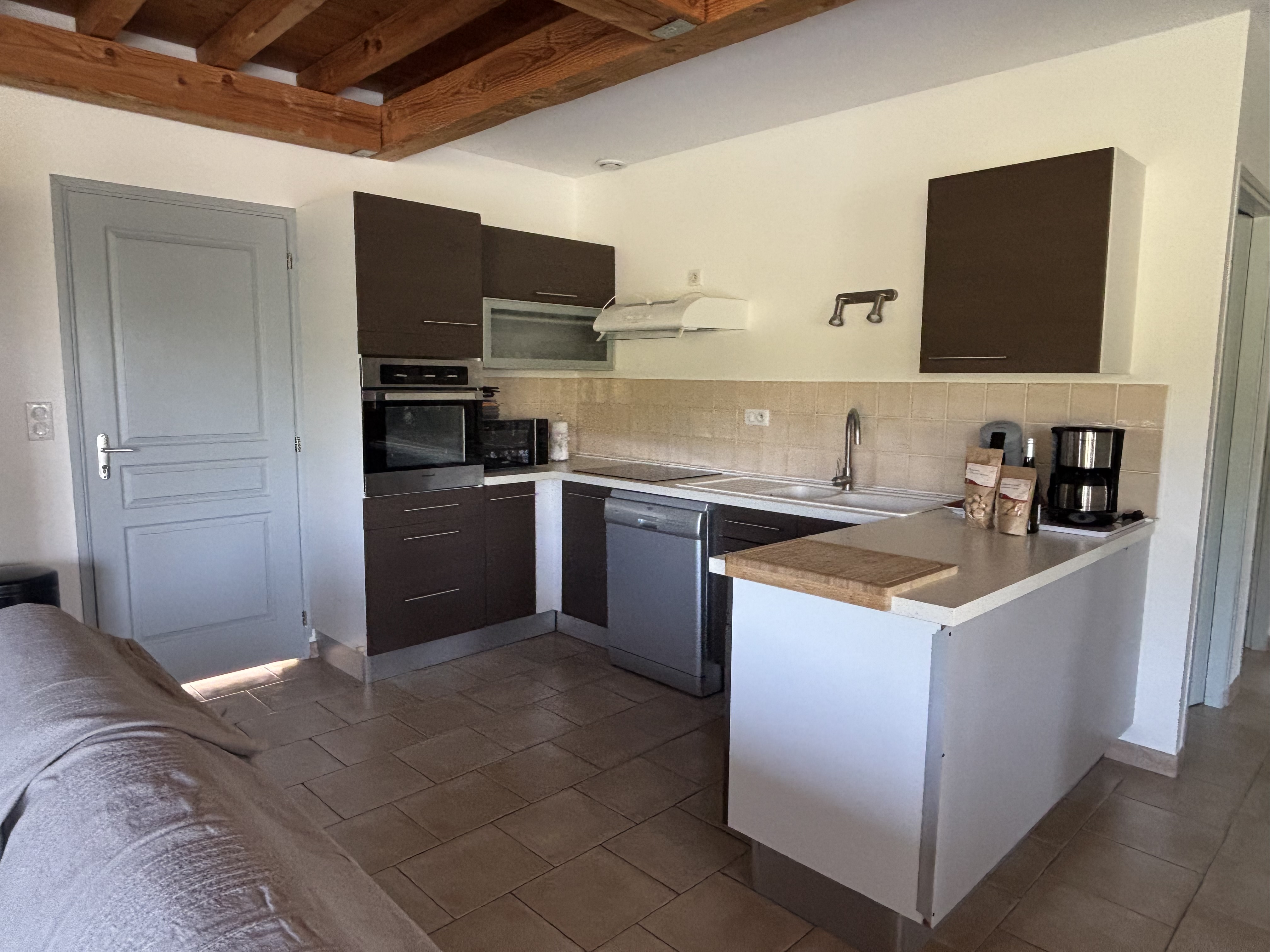 La cuisine est entièrement équipée : four, micro-ondes, plaque à induction 4 feux, cafetières (Senseo et filtre), presse-agrumes, grille-pain et de nombreux ustensiles pour cuisiner comme à la maison.