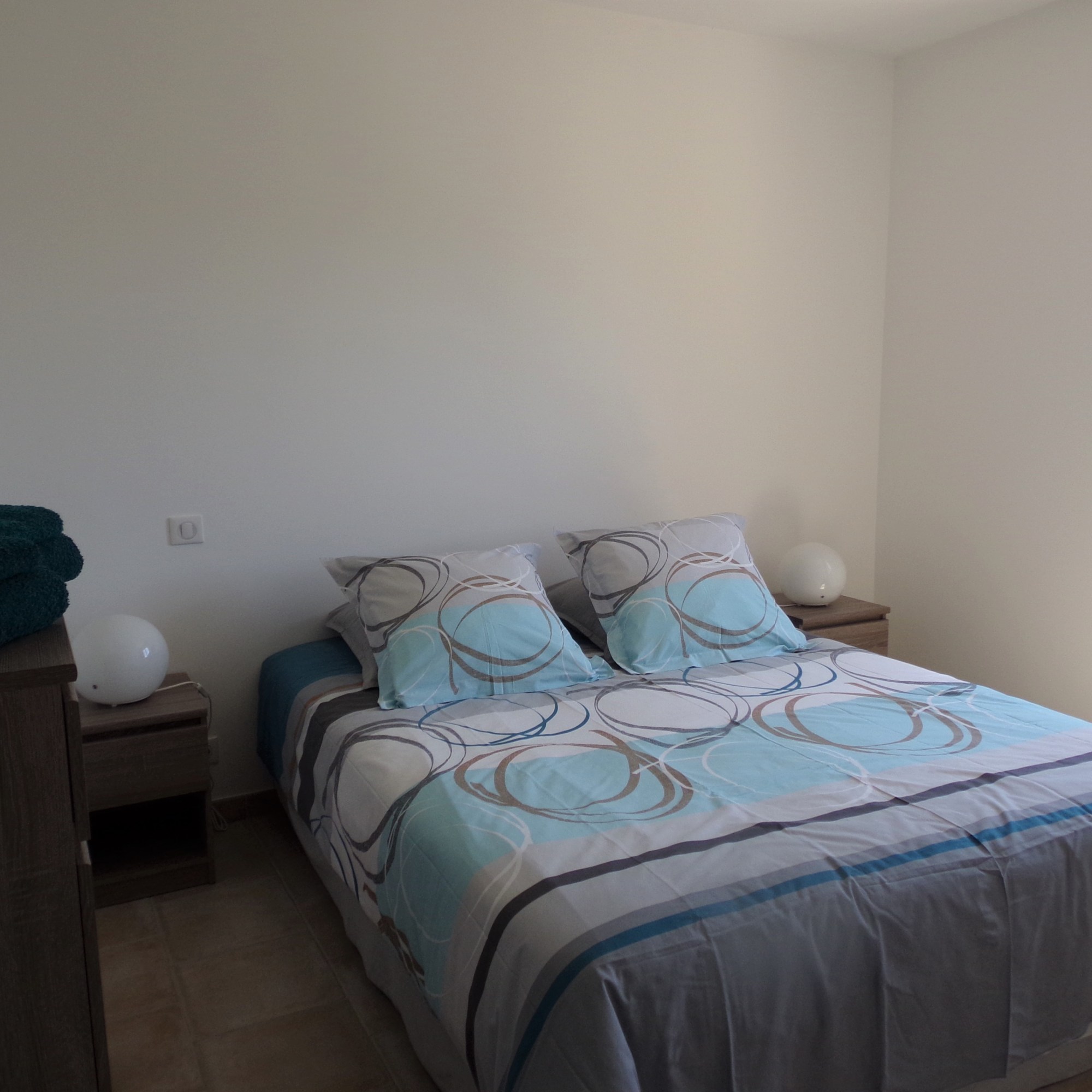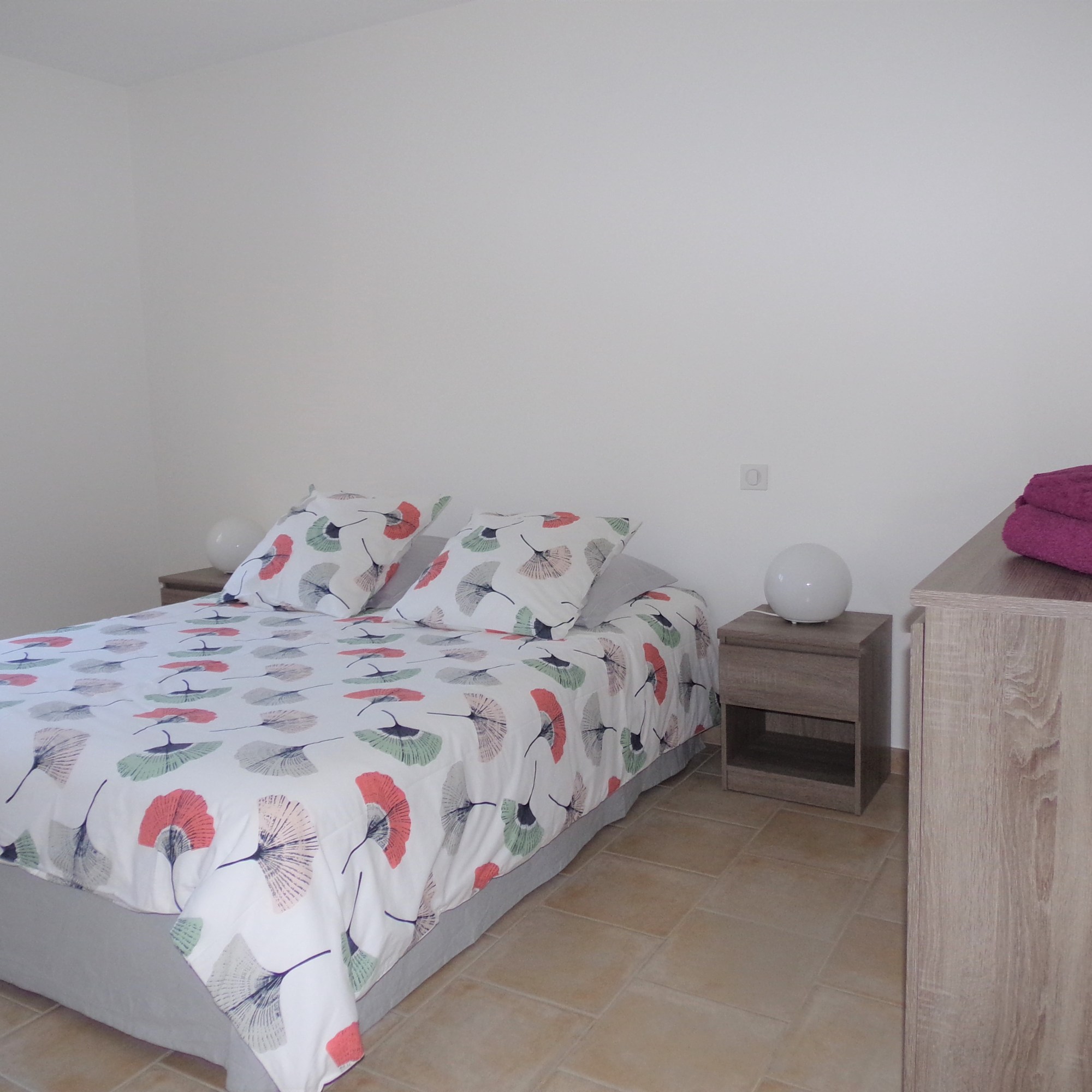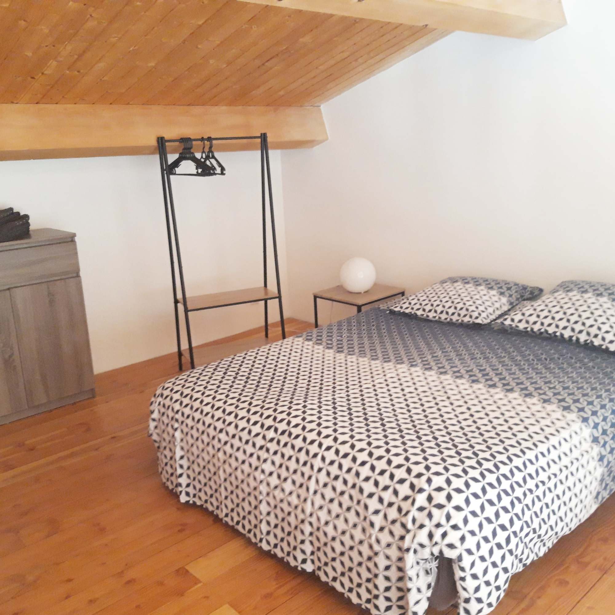 Cette chambre dispose d’un lit double, d’une commode, de tables de chevet et d’une penderie. Parfaite pour accueillir couples ou enfants.