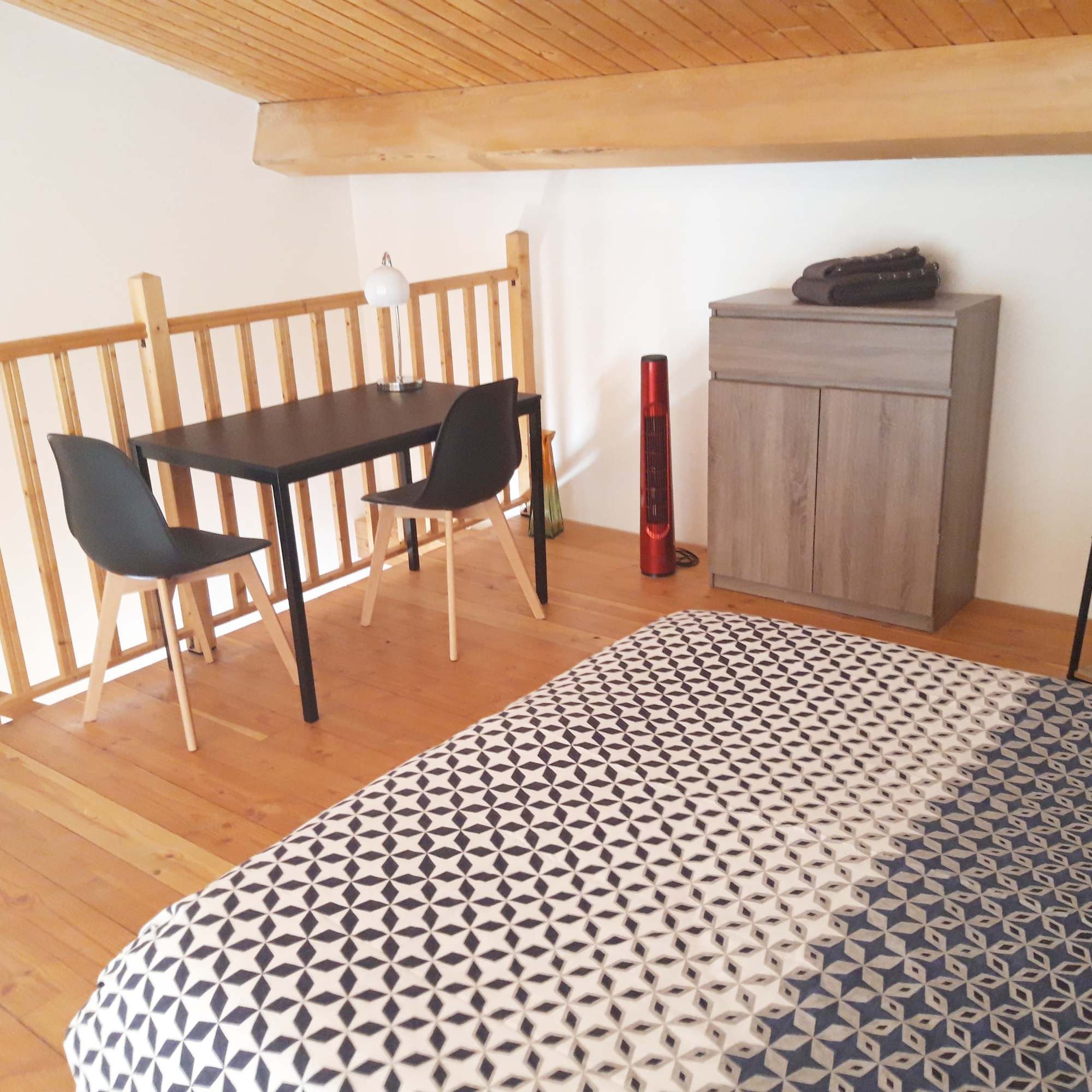 AmĂ©nageable en espace nuit, la mezzanine dispose d’un canapĂ© convertible (160×200), d’une commode, de tables basses, d’une penderie, ainsi que d’un bureau avec deux chaises — un espace multifonction entre repos et tĂ©lĂ©travail.